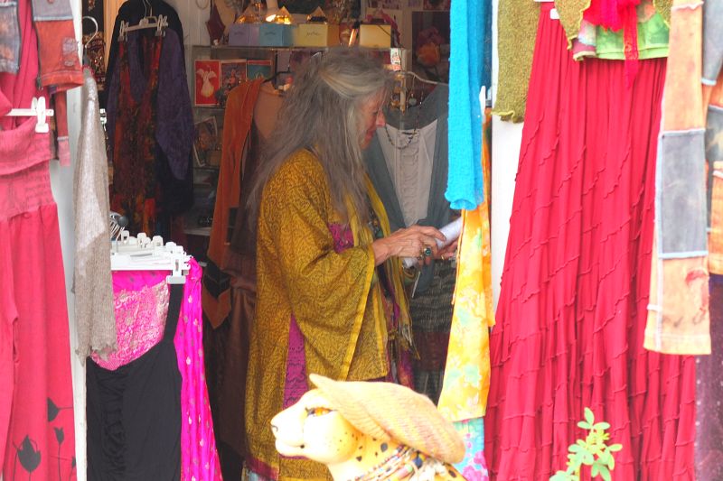 schele mevrouw tussen borduurwerk in het textilmuseum